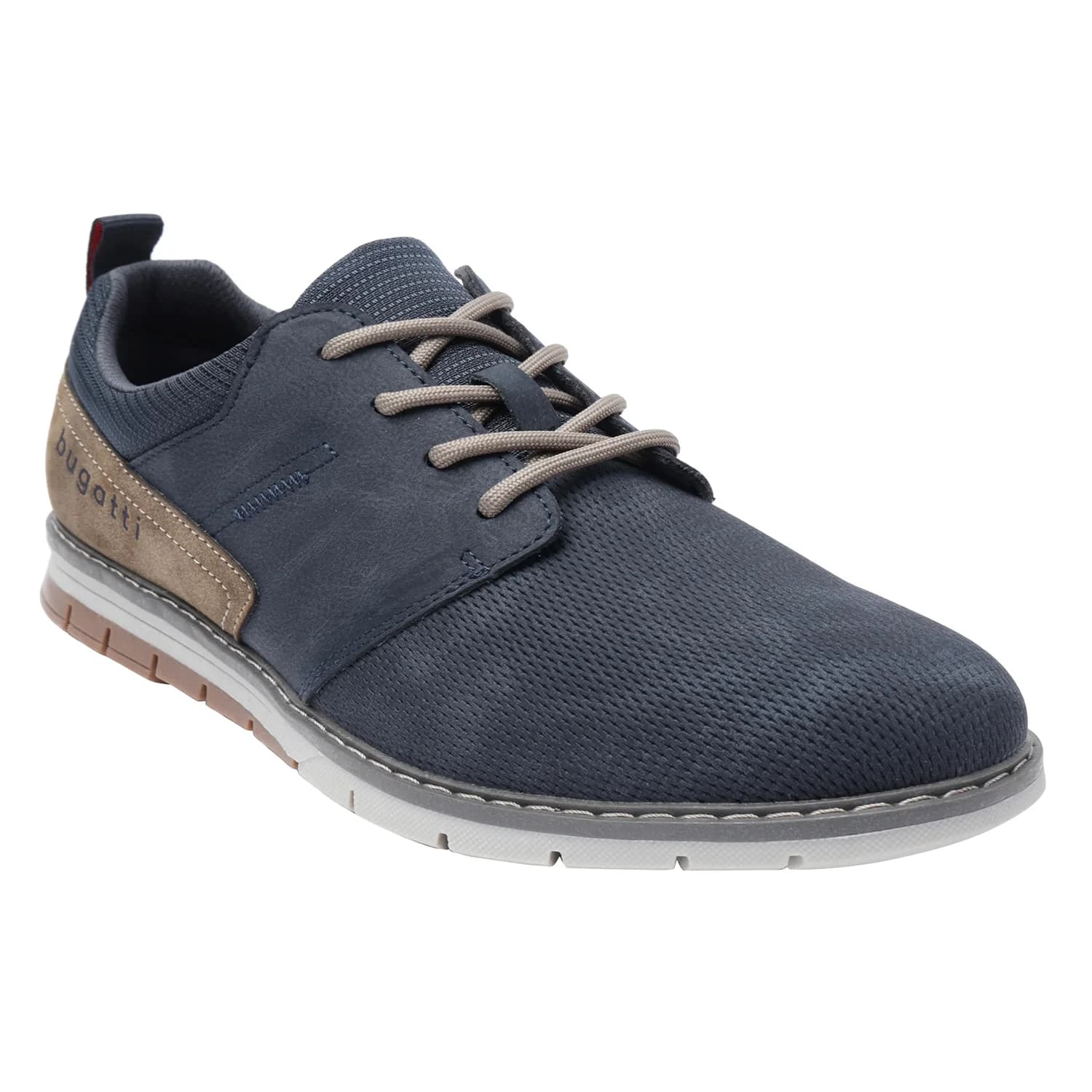 A shoe for the urban jungle. bugatti Sandman dark blue and taupe sneakers. Comes with a fashionable contra-colour patch on the heels, complemented by matching laces. The latest from Europe.